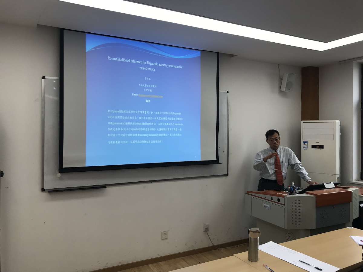 On December 5th, 2018, Professor Zongshan Zou Graduate Institute of Statistics National Central University, Taiwan, China, delivered a speech named “Robust likelihood inference for diagnostic accuracy measures for paired organs”, to the staff and students from Institute of Statistics and Big Data at Renmin University of China. Prof. Liping Zhu, chaired the lecture. He emphasized the practical value of this study and hoped that the participants could learn more about robust likelihood inference.