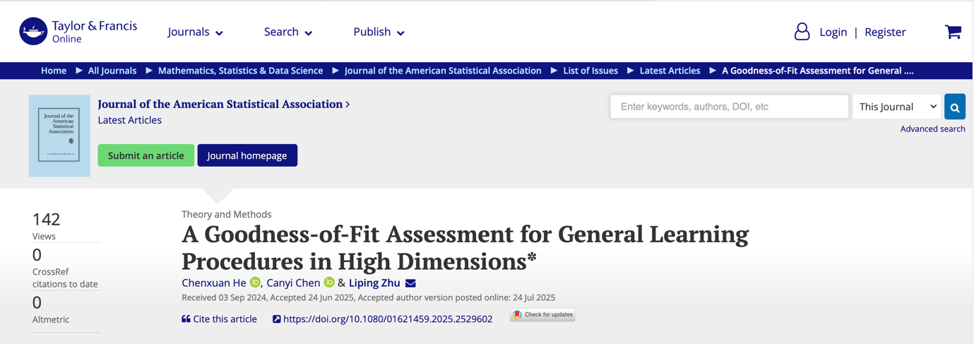 近日,探花Porn博士生何辰轩作为第一作者的论文“A Goodness-of-Fit Assessment for General Learning Procedures in High Dimensions”被统计学顶级期刊Journal of the American Statistical Association接收。