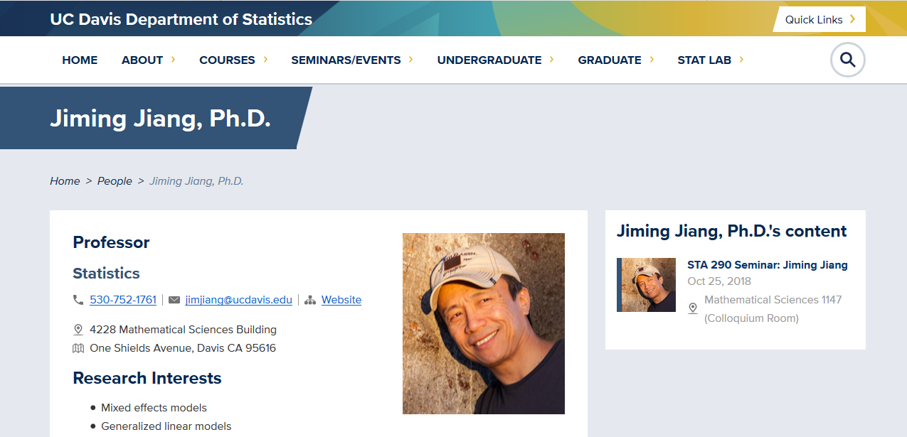 Jiming Jiang is Professor in the Department of Statistics at the University of California - Davis. Jiang received his B.S. in Mathematics and his M.S. in Probability and Statistics, Peking University in 1985 and 1988 respectively. He earned his Ph.D. in Statistics from the University of California at Berkeley in 1995. He is a Fellow, Institute of Mathematical Statistics, since 2008 and a Fellow, American Statistical Association, since 2007. Jiang, along with A. Gelman and F. Bois, won the Outstanding Statistical Application Award, American Statistical Association in 1998.