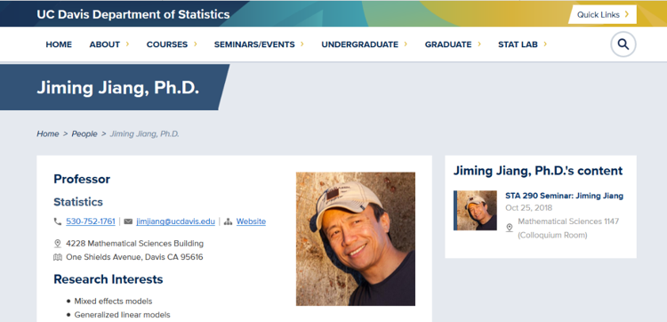 Jiming Jiang is Professor in the Department of Statistics at the University of California - Davis. Jiang received his B.S. in Mathematics and his M.S. in Probability and Statistics, Peking University in 1985 and 1988 respectively. He earned his Ph.D. in Statistics from the University of California at Berkeley in 1995. He is a Fellow, Institute of Mathematical Statistics, since 2008 and a Fellow, American Statistical Association, since 2007. Jiang, along with A. Gelman and F. Bois, won the Outstanding Statistical Application Award, American Statistical Association in 1998.