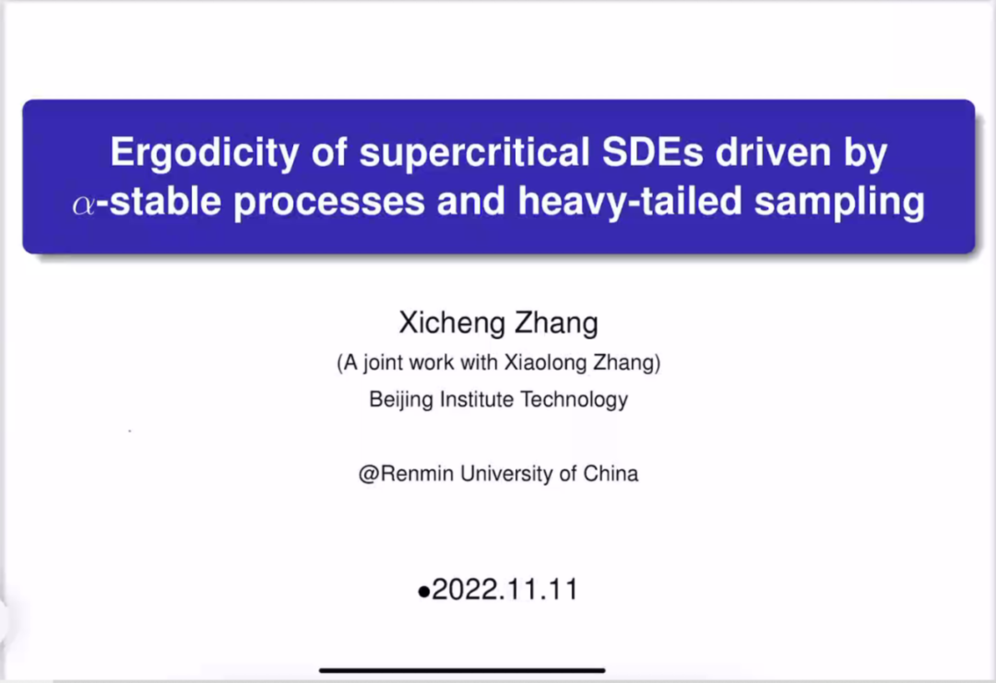 下午15:00,北京理工大学数学与统计探花Porn 教授张希承应探花Porn邀请进行了以“Ergodicity of supercritical SDEs driven by α-stable processes and heavy-tailed sampling”为主题的讲座。
