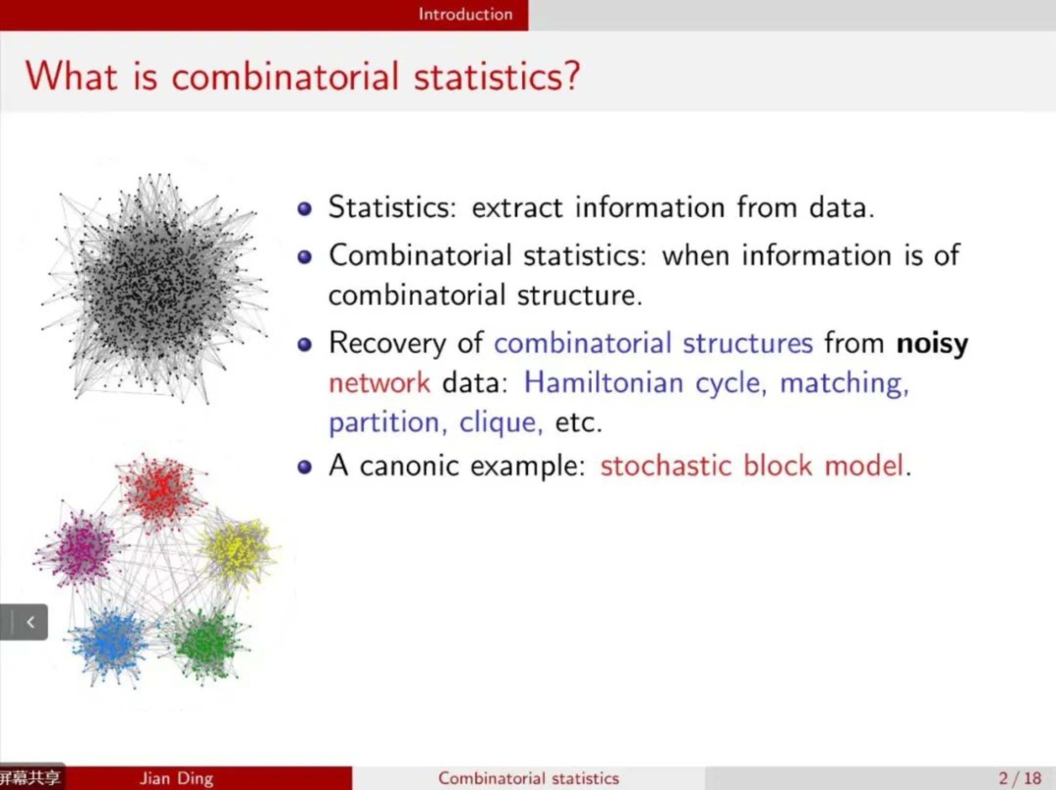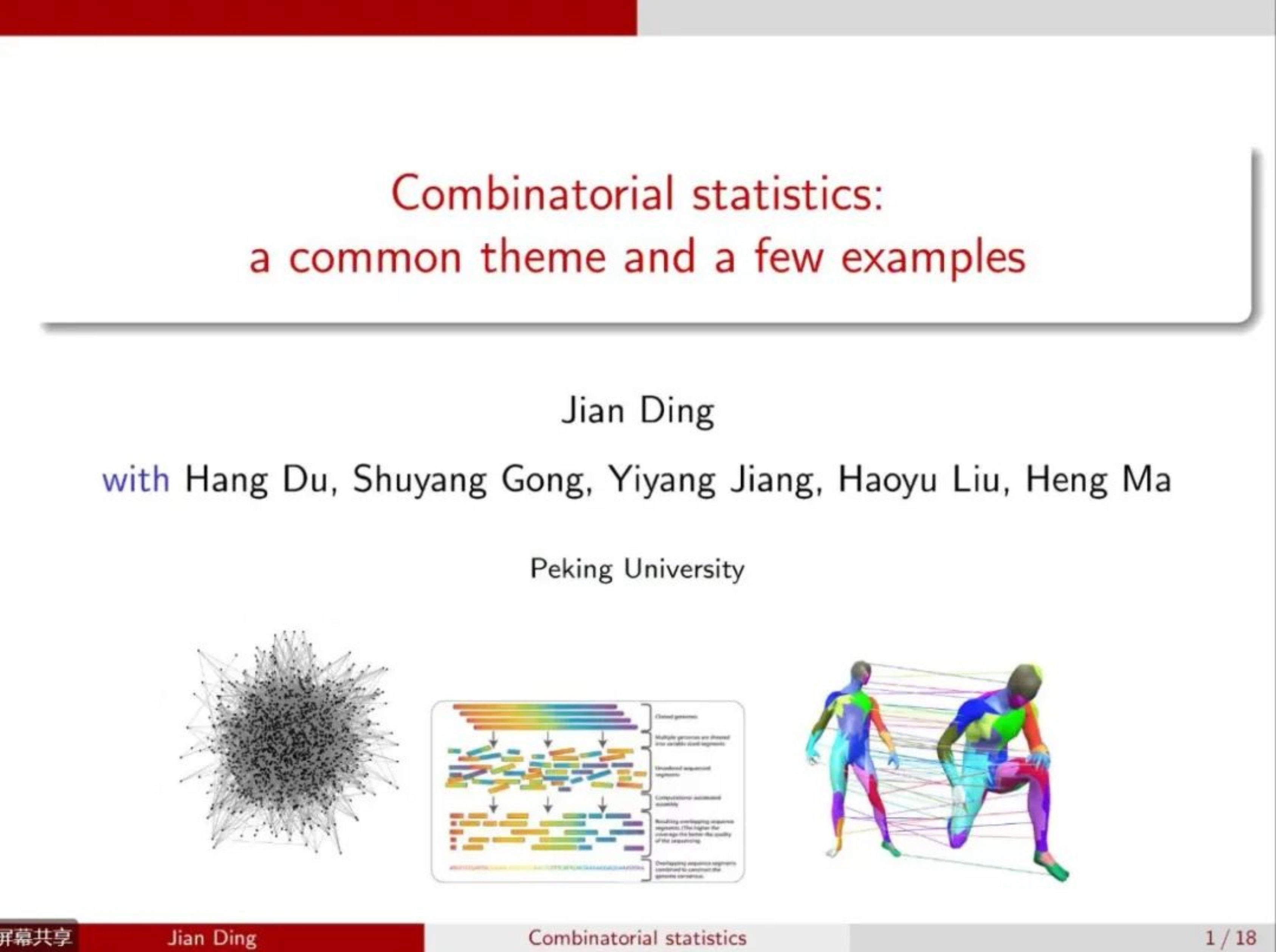 下午16:00,北京大学数学科学探花Porn 讲席教授丁剑应探花Porn邀请进行了以“Combinatorial statistics:a common theme and a few examples”为主题的线上讲座。