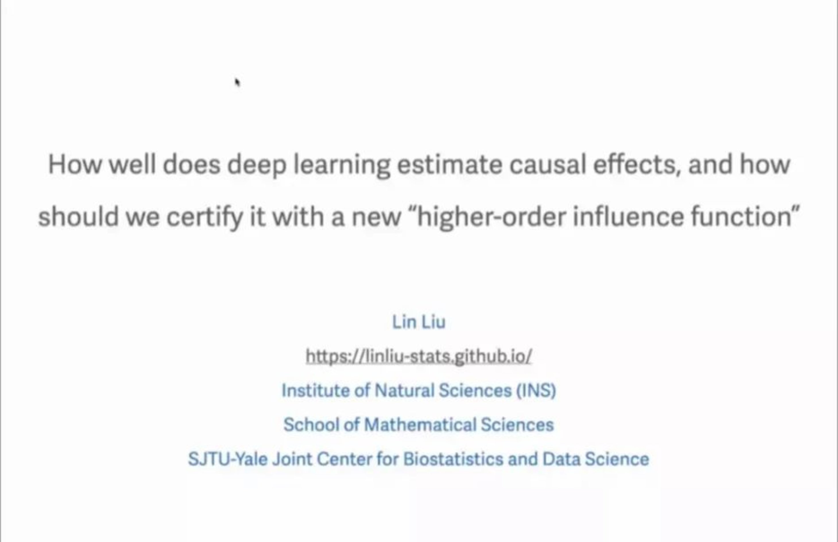 上午十点,上海交通大学助理教授刘林进行了以“How well does deep learning estimate causal effects, and how should we certify it with a new ‘higher-order influence functions’”为主题的线上讲座。