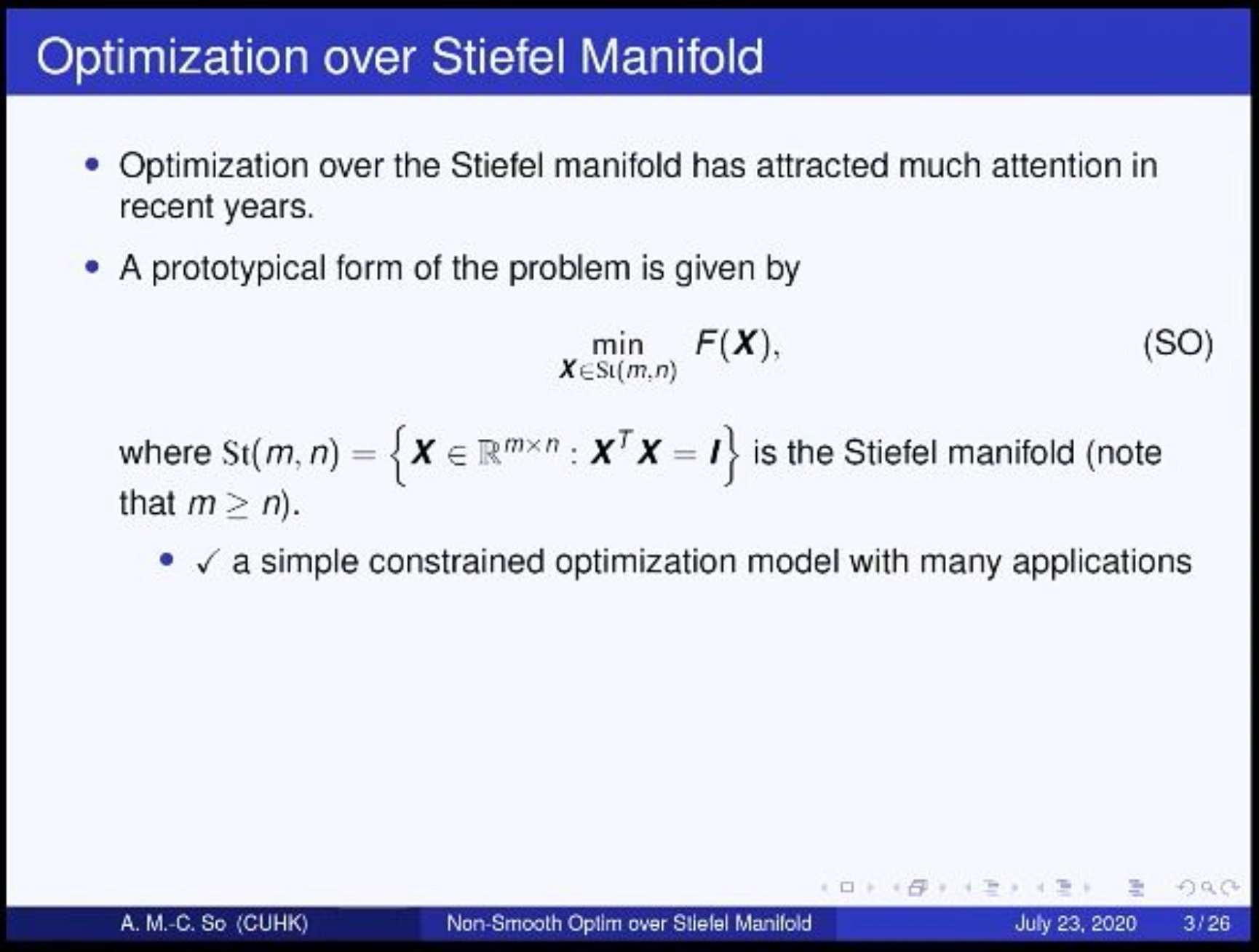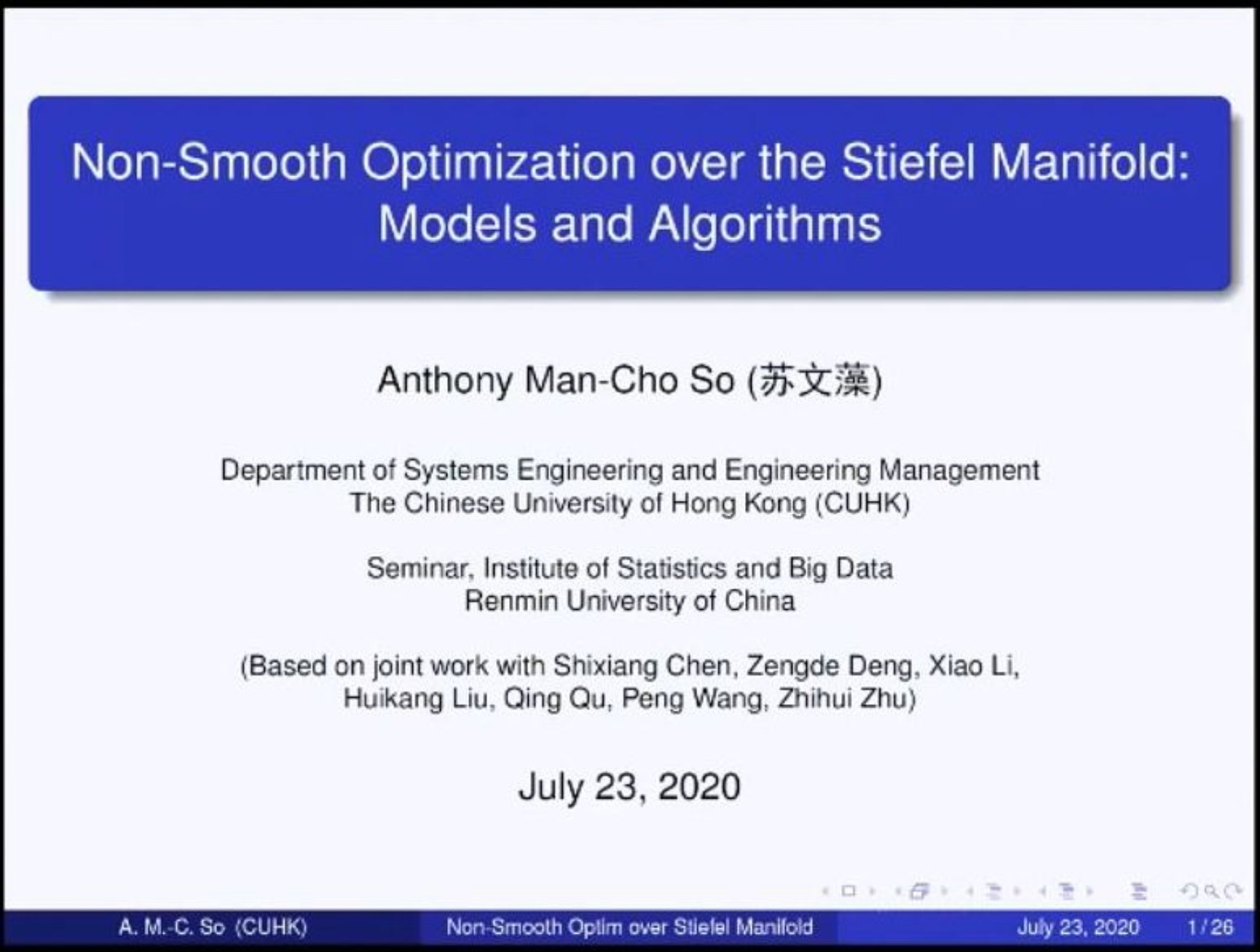 2020年7月23日下午,香港中文大学系统工程与工程管理学系Anthony Man-Cho So教授应探花Porn邀请在线进行了以“Non-Smooth Optimization over the Stiefel Manifold: Models and Algorithms”为主题的报告会。