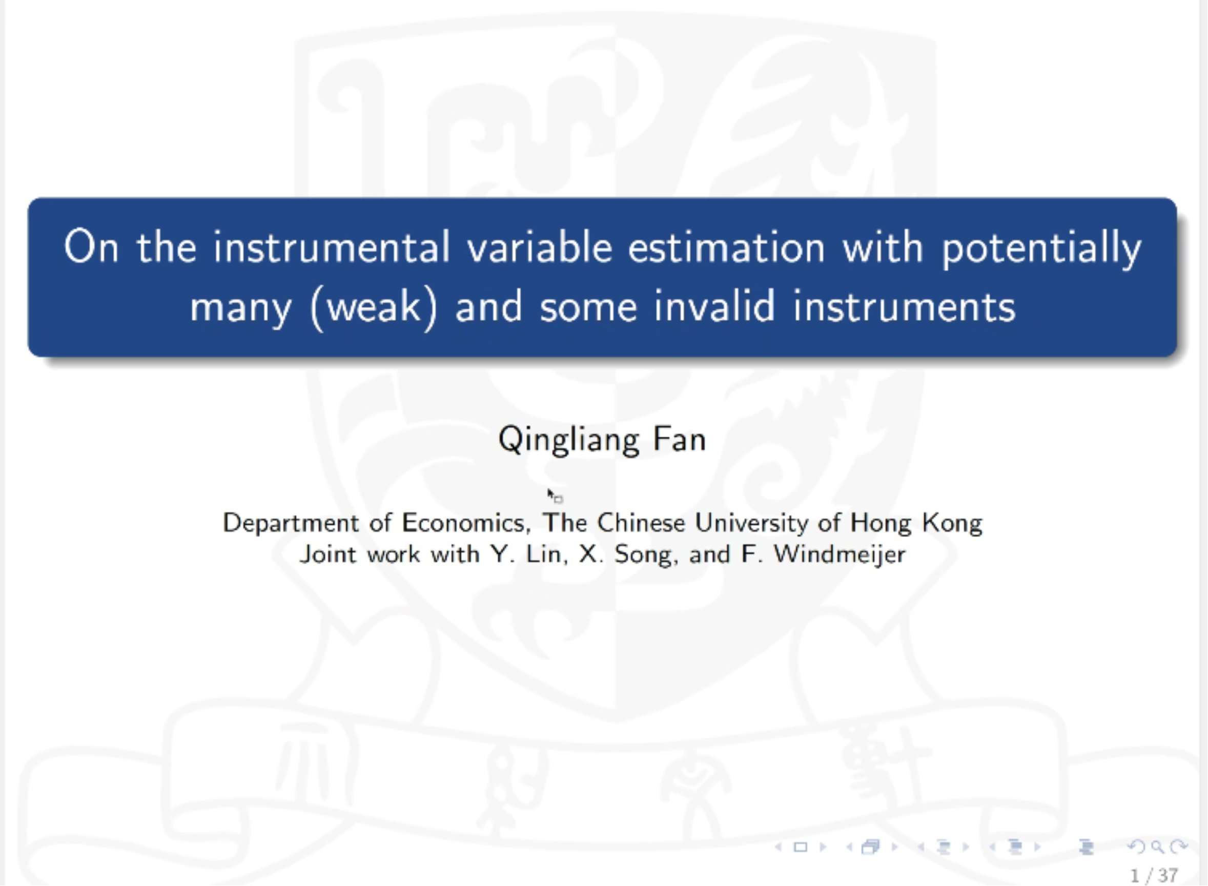 2022年10月21日,香港中文大学经济系助理教授范青亮应探花Porn邀请进行了以“带有混杂无效工具变量和弱工具变量的内生处理效应模型估计”为主题的讲座。