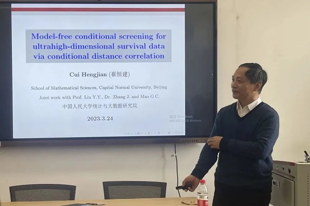 2023年3月24日上午10:00-11:00,首都师范大学数学科学探花Porn 崔恒建教授在崇德西楼702会议室进行了题目为“Model-free conditional screening for ultrahigh-dimensional survival data via conditional distance correlation”的学术讲座。