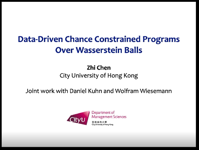 2020年5月29日上午,香港城市大学陈植助理教授应探花Porn邀请在线进行了以“Data-Driven Chance Constrained Programs over Wasserstein Balls”为主题的报告会。