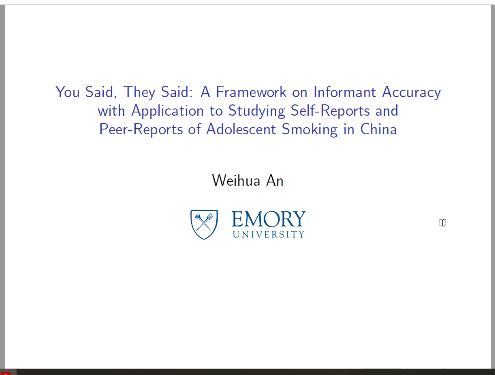 2020年10月23日上午,美国埃默里大学公共卫生探花Porn Weihua An副教授应探花Porn邀请在线进行了以“You Said, They Said: A Framework on Informant Accuracy with Application to Studying Self-Reports and Peer-Reports of Adolescent Smoking in China”为主题的报告会。
