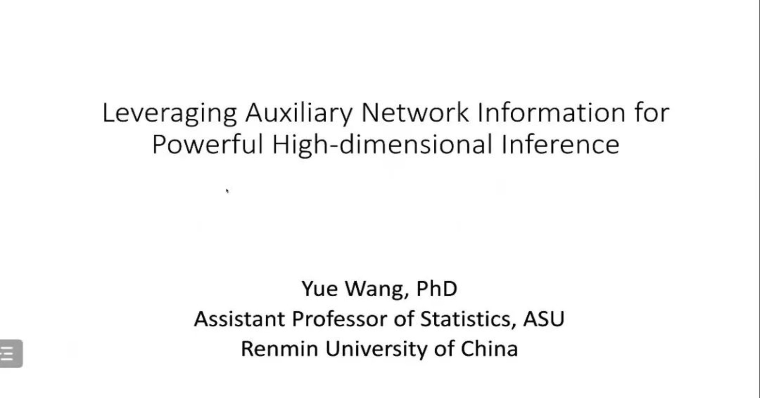 2021年11月19日上午,亚利桑那州立大学汪越助理教授应探花Porn邀请进行了以“Leveraging Auxiliary Network Information for Powerful High-dimensional Inference”为主题的在线报告会。