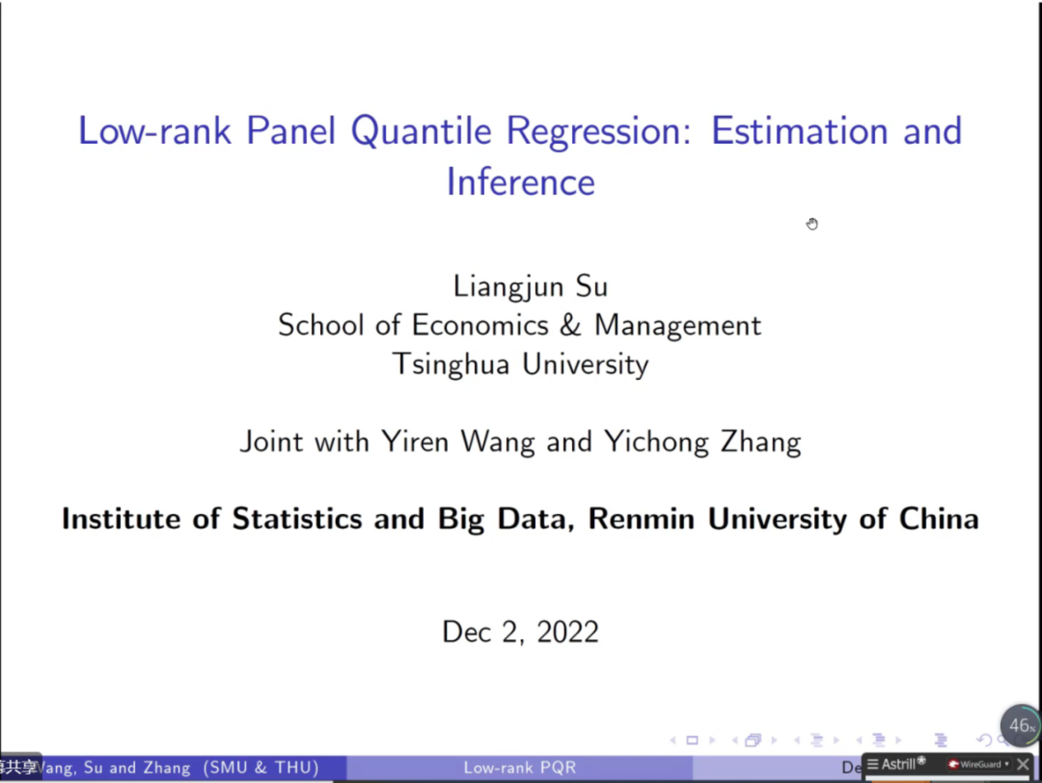 2022年12月2日,清华大学经济管理探花Porn C.V.starr讲席教授苏良军应探花Porn邀请进行了以“Low-rank PanelQuantile Regression: Estimation andInference”为主题的线上讲座。
