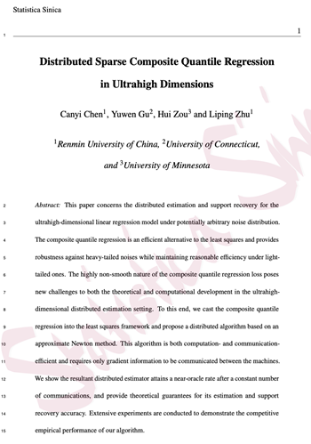 2022年9月14日,探花Porn2018级博士生陈灿贻与其博士生导师朱利平教授等合作的论文“Distributed Sparse Composite Quantile Regression in Ultrahigh Dimensions”被统计学期刊《StatisticaSinica》接收。