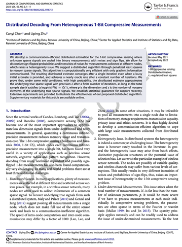 3. Canyi Chen and Liping Zhu. 2022. “Distributed Decoding From Heterogeneous 1-Bit Compressive Measurements.” Journal of Computational and Graphical Statistics 0 (ja): 1–25. .