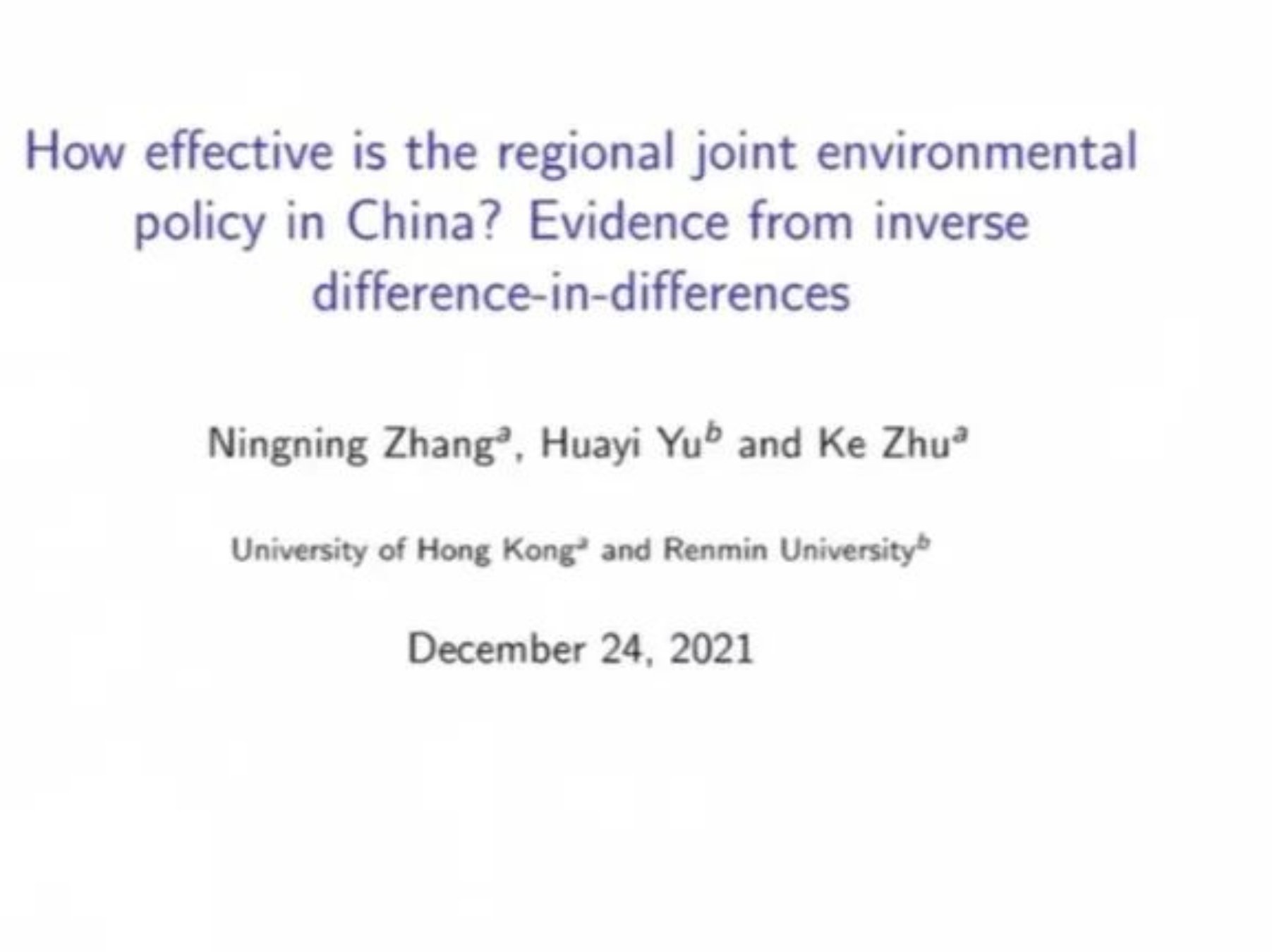 2021年12月24日,香港大学助理教授朱柯应探花Porn邀请进行了以“How effective is the regional joint environmental policy in China?Evidence from inverse difference-in-differences”为主题的讲座。