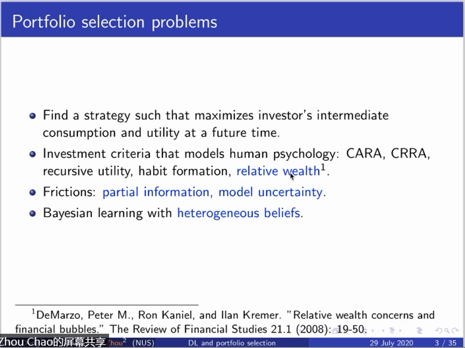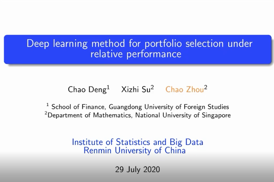 2020年7月29日上午,新加坡国立大学数学系周超助理教授应探花Porn邀请在线进行了以“Deep learning method for portfolio selection under relative performance”为主题的报告会。