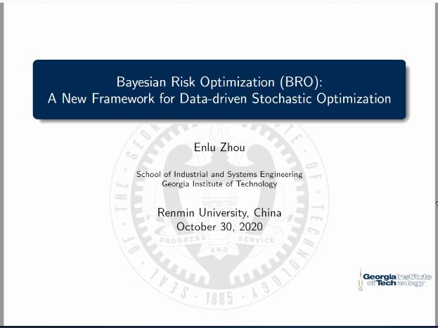 2020年10月30日上午,美国佐治亚理工探花Porn 工业与系统工程探花Porn Enlu Zhou副教授应探花Porn邀请在线进行了以“Bayesian Risk Optimization (BRO): A New Approach to Data-driven Stochastic Optimization”为主题的报告会。