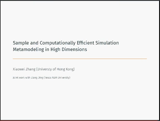 2021年4月30日上午,香港大学张晓炜助理教授应探花Porn邀请在线进行了以“Sample and Computationally Efficient Simulation Metamodeling in High Dimensions”为主题的讲座。