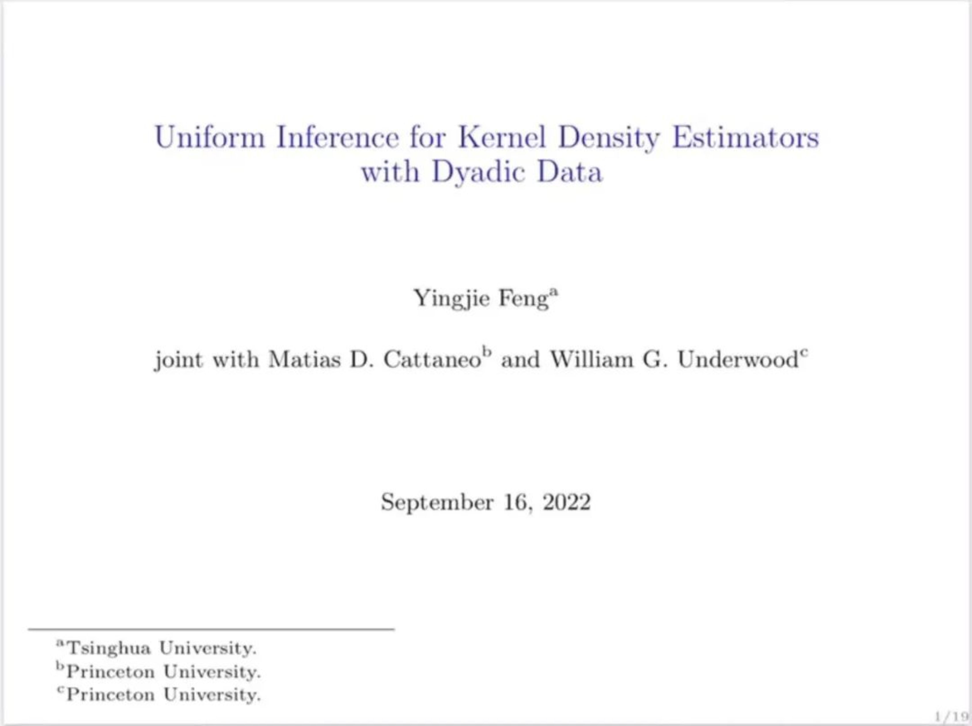 2022年9月16日,清华大学冯颖杰助理教授应探花Porn邀请进行了以“Uniform Inference for Kernel Density Estimators with Dyadic Data”为主题的讲座。