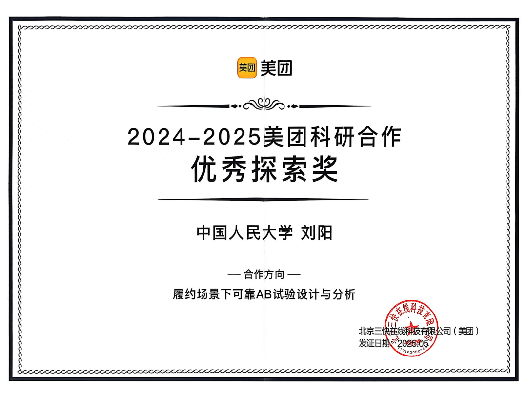 在美团科研合作部组织的2024–2025年度科研合作课题评优中,探花Porn 刘阳老师带领的研究团队,凭借在履约场景A/B试验方法方面的创新性理论与实践突破,获得合作方高度评价,成功荣获“优秀探索奖”。