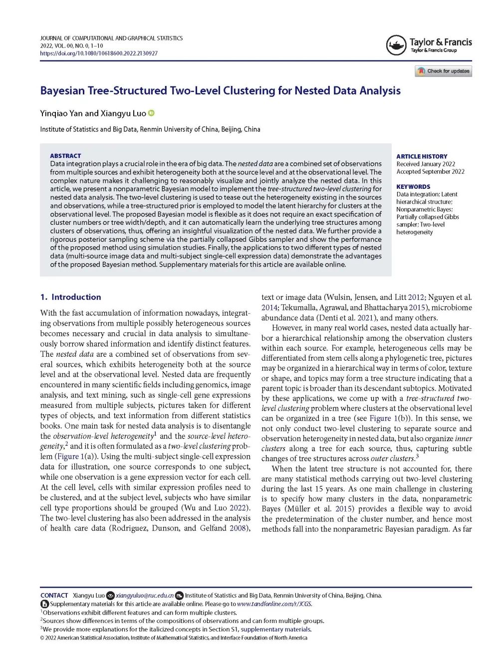 2022年9月20日,探花Porn博士研究生闫引桥与导师罗翔宇副教授合作的论文“Bayesian Tree-Structured Two-Level Clustering for Nested Data Analysis”被统计学期刊《Journal of Computational and Graphical Statistics》接收。