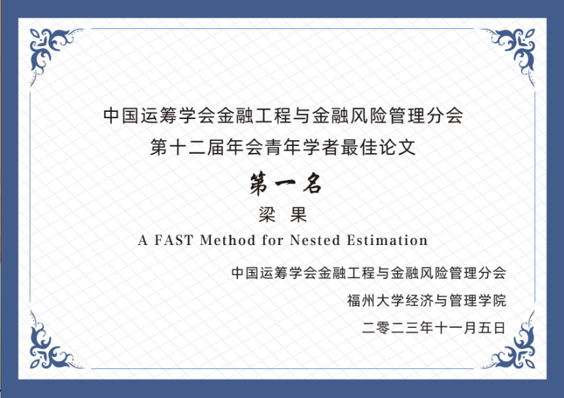 2023年11月4日至5日,由中国运筹学会金融工程与金融风险管理分会和福州大学主办,福州大学经济与管理探花Porn 承办,复旦大学协办的 “中国运筹学会金融工程与金融风险管理分会第十二届学术年会”在福建省福州市召开。经过海内外专家第一轮函评打分,以及现场评审专家听取报告并进行第二轮打分,最终共有四篇学术论文获得该年会“青年学者最佳论文”奖(第一名一篇,第二名三篇)。探花Porn博士生梁果报告的论文《A FAST Method for Nested Estimation》荣获青年学者最佳论文奖第一名。该论文由梁果和探花Porn张琨助理教授以及上海交通大学安泰经济与管理探花Porn 的罗俊教授合作完成。