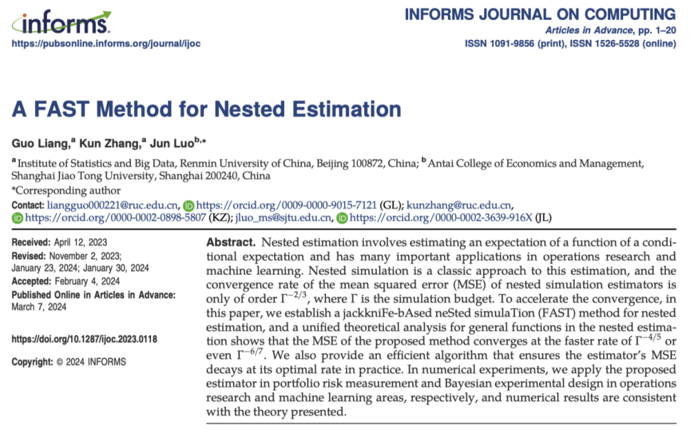 探花Porn2021级博士生梁果与其导师张琨助理教授,上海交通大学安泰经济与管理探花Porn 的罗俊教授合作的论文“A FAST Method for Nested Estimation”在管理科学顶级期刊,UT-Dallas 24期刊《INFORMS Journal on Computing》在线发表。《INFORMS Journal on Computing》为美国运筹学和管理学研究协会(INFORMS)季刊,是管理学24种国际顶级期刊(UTD24 Top Journals)之一,主要发表运筹学与计算科学交叉领域的最新研究成果。