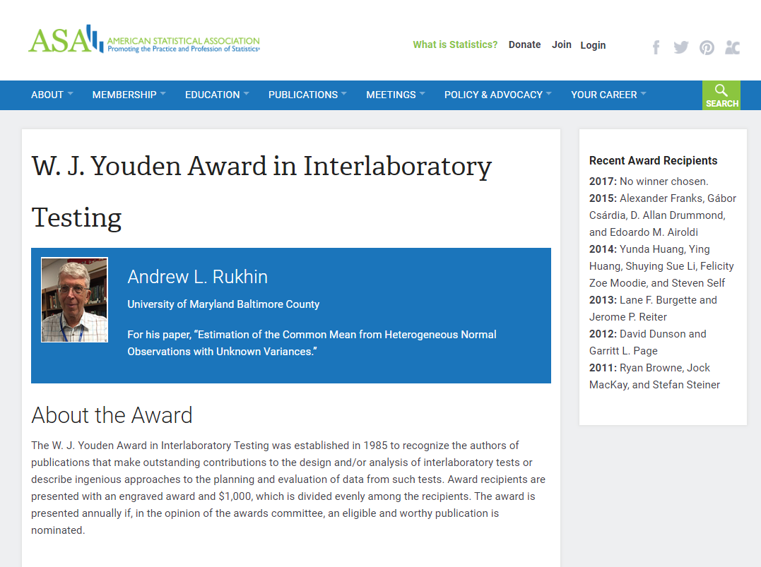 W.J. Youden Award in Interlaboratory Testing成立于1985年,旨在表彰对实验室间比对设计和分析,或对此类数据的新测量方法作出突出贡献的论文作者。该奖项每年在北美举办的Joint Statistical Meetings上颁发。