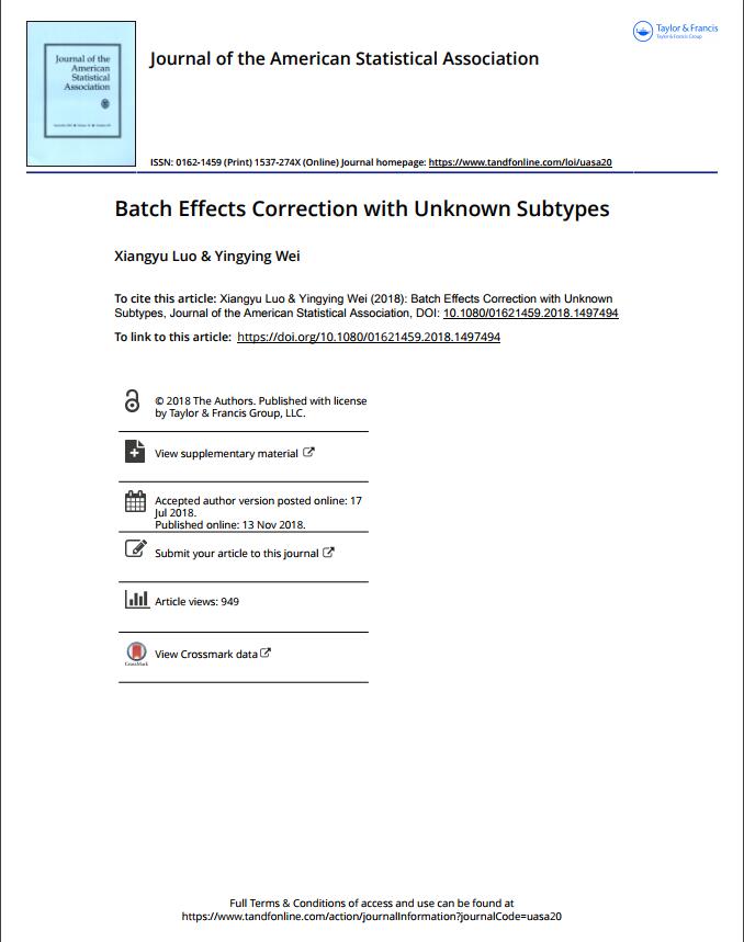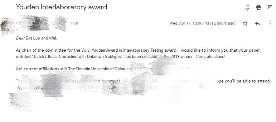 近日,在本年度的W.J. Youden Award in Interlaboratory Testing奖项评选中,探花Porn罗翔宇助理教授和香港中文大学统计系魏颖颖教授因合作的论文《Batch Effects Correction with Unknown Subtypes》成功获此殊荣。